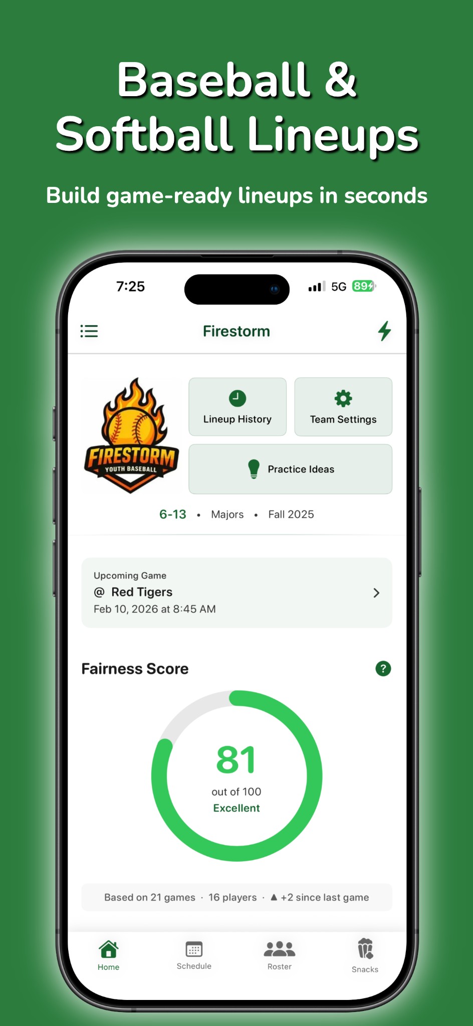 Move from rosters and schedules to lineups and fairness views in one workflow that is built for youth baseball and softball teams.