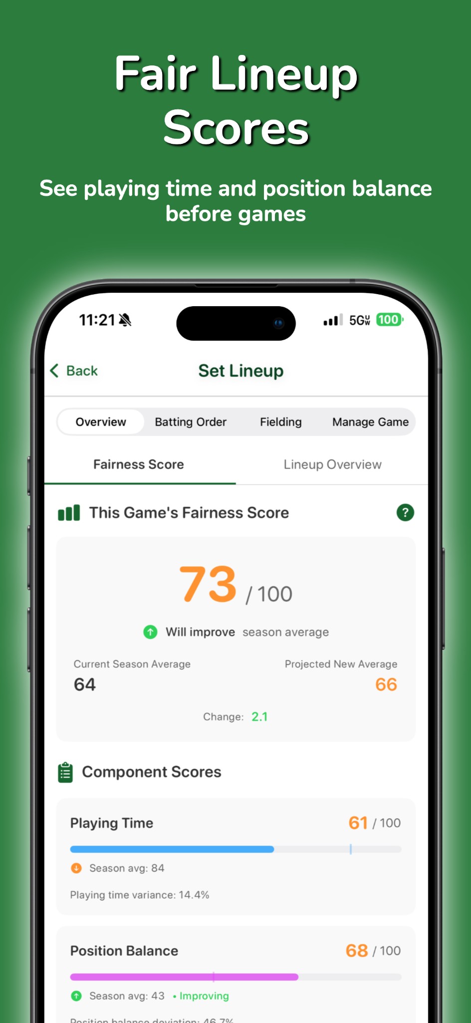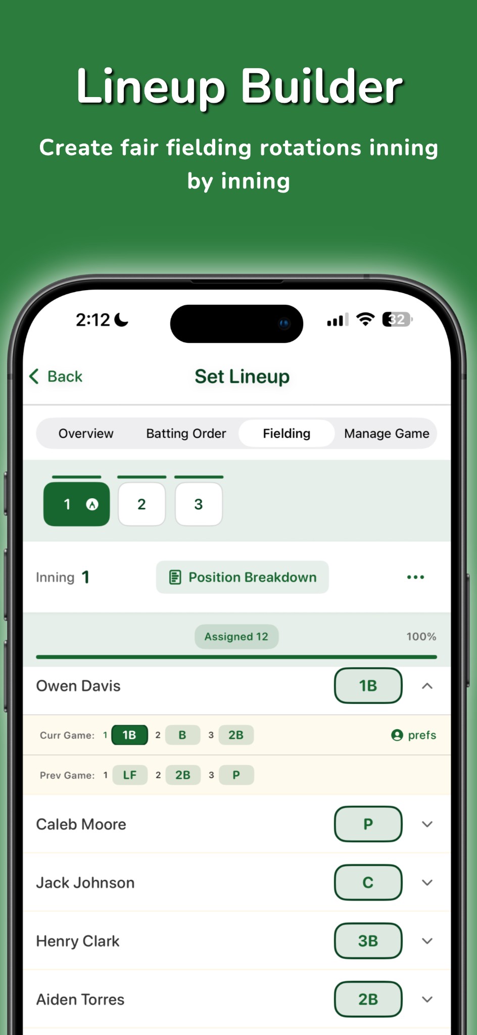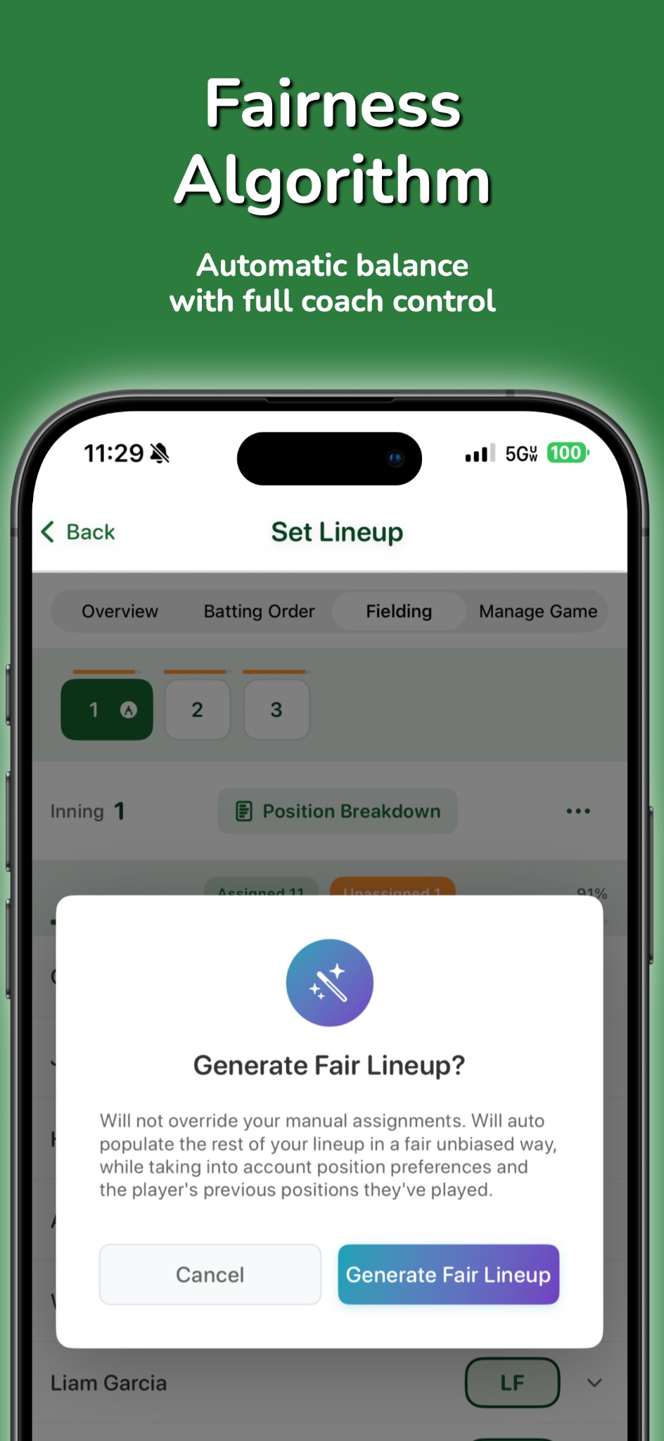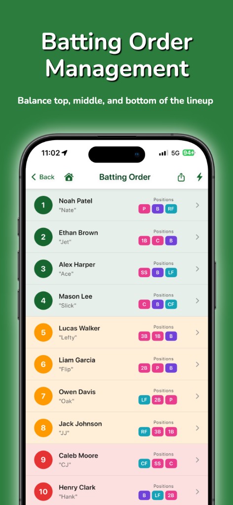 Create game-ready batting orders, manage defensive rotations, and keep player opportunities balanced when you need an answer fast.