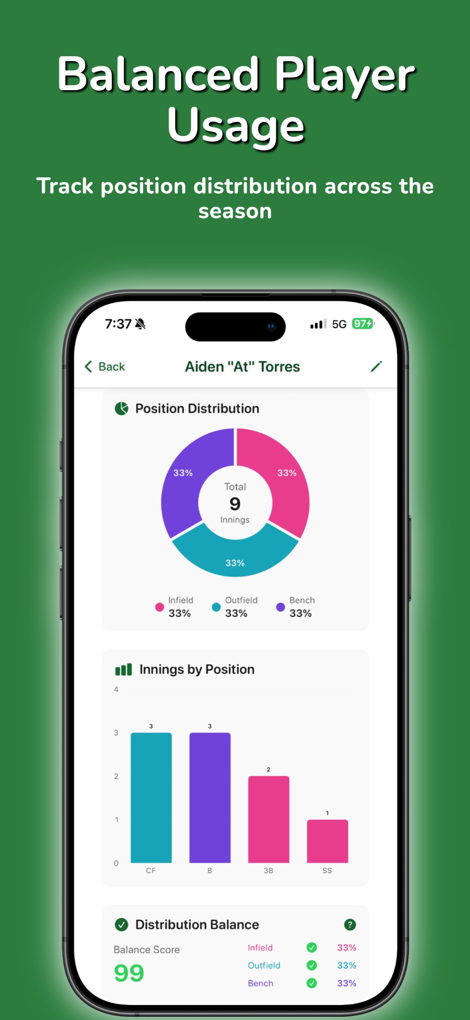Keep lineups, fairness, and season logistics together in one app built for youth baseball and softball coaches on iPhone and iPad.